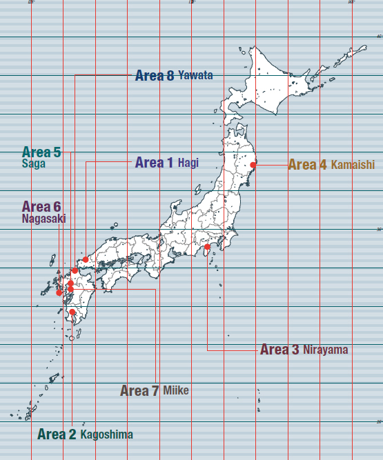 福岡県:北九州市;大牟田市;中間市、佐賀県:佐賀市、長崎県:長崎市、