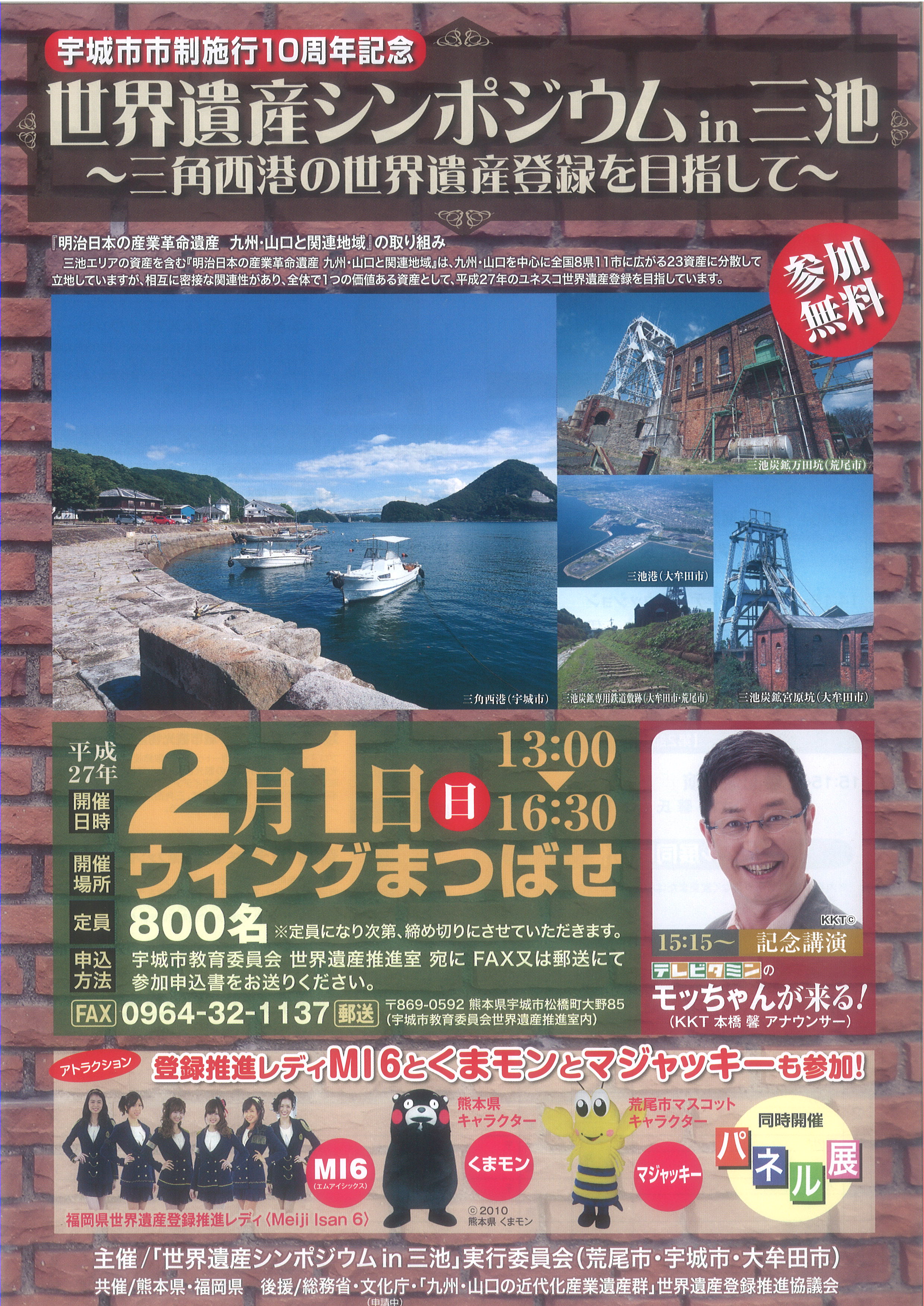 このたび、宇城市、荒尾市、大牟田市の合同で世界遺産シンポジウムを開催することとなりました。