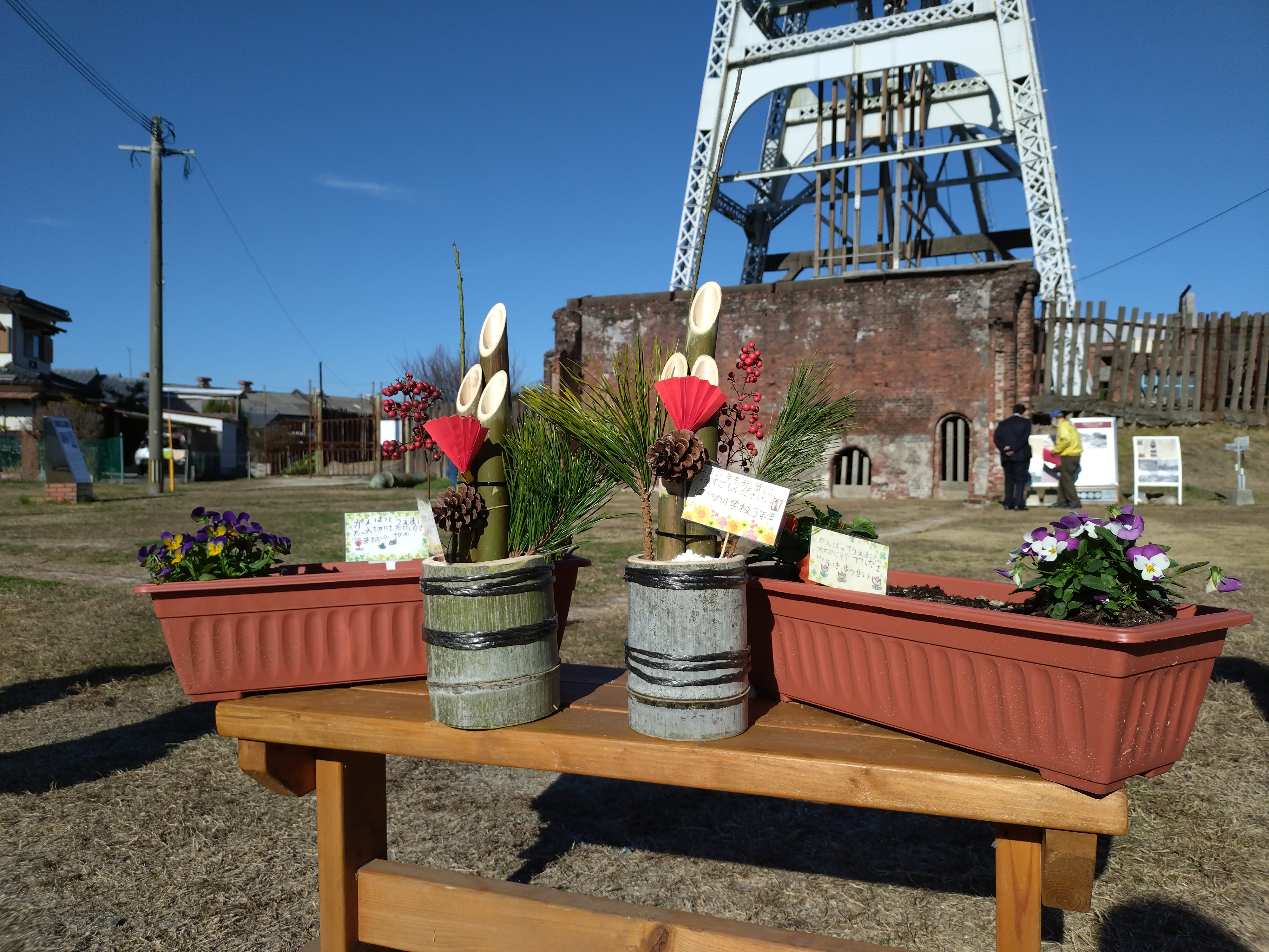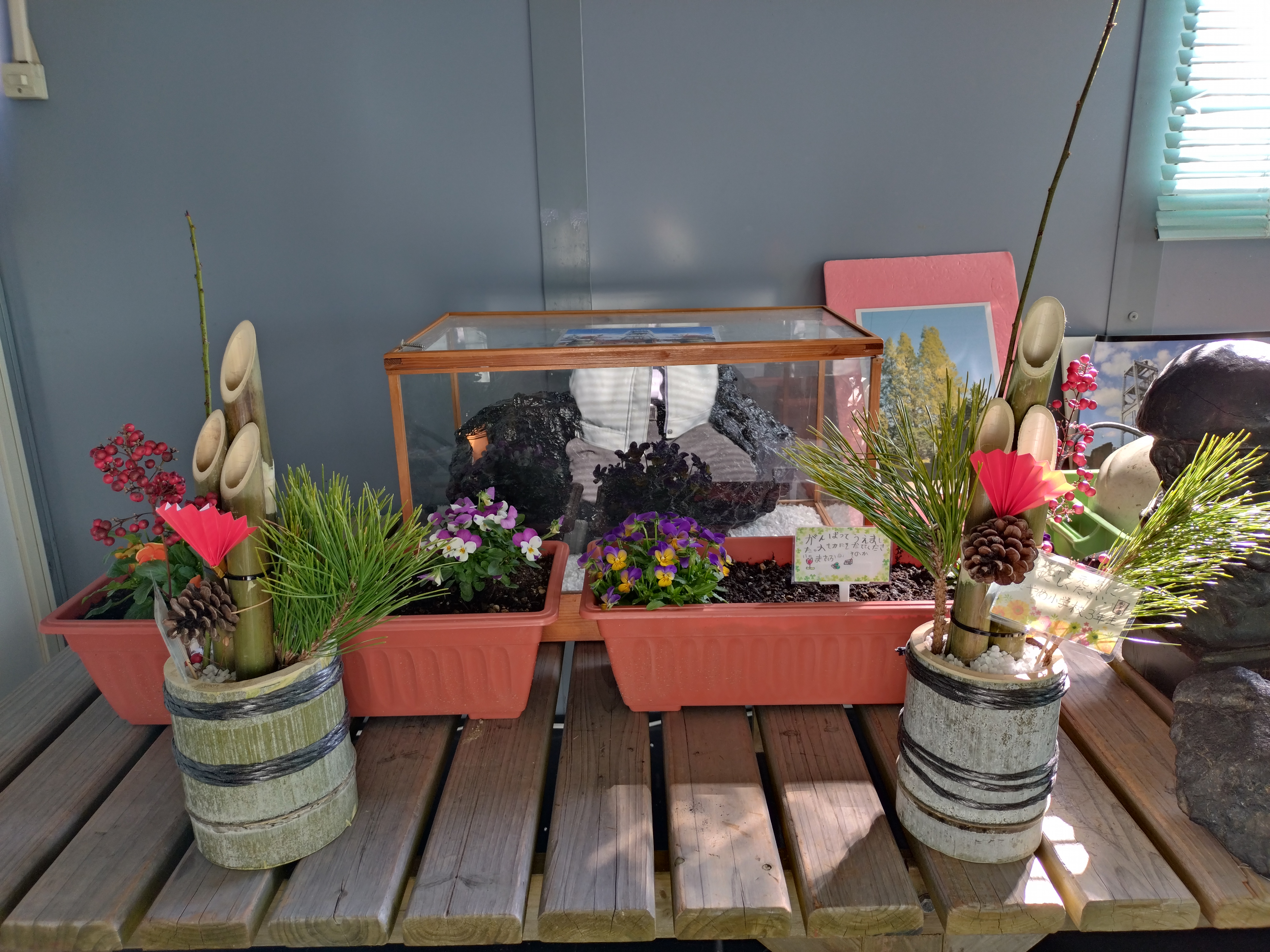 駛馬小学校3年生の子供たちがミニ門松とプランターを寄贈してくださいました。