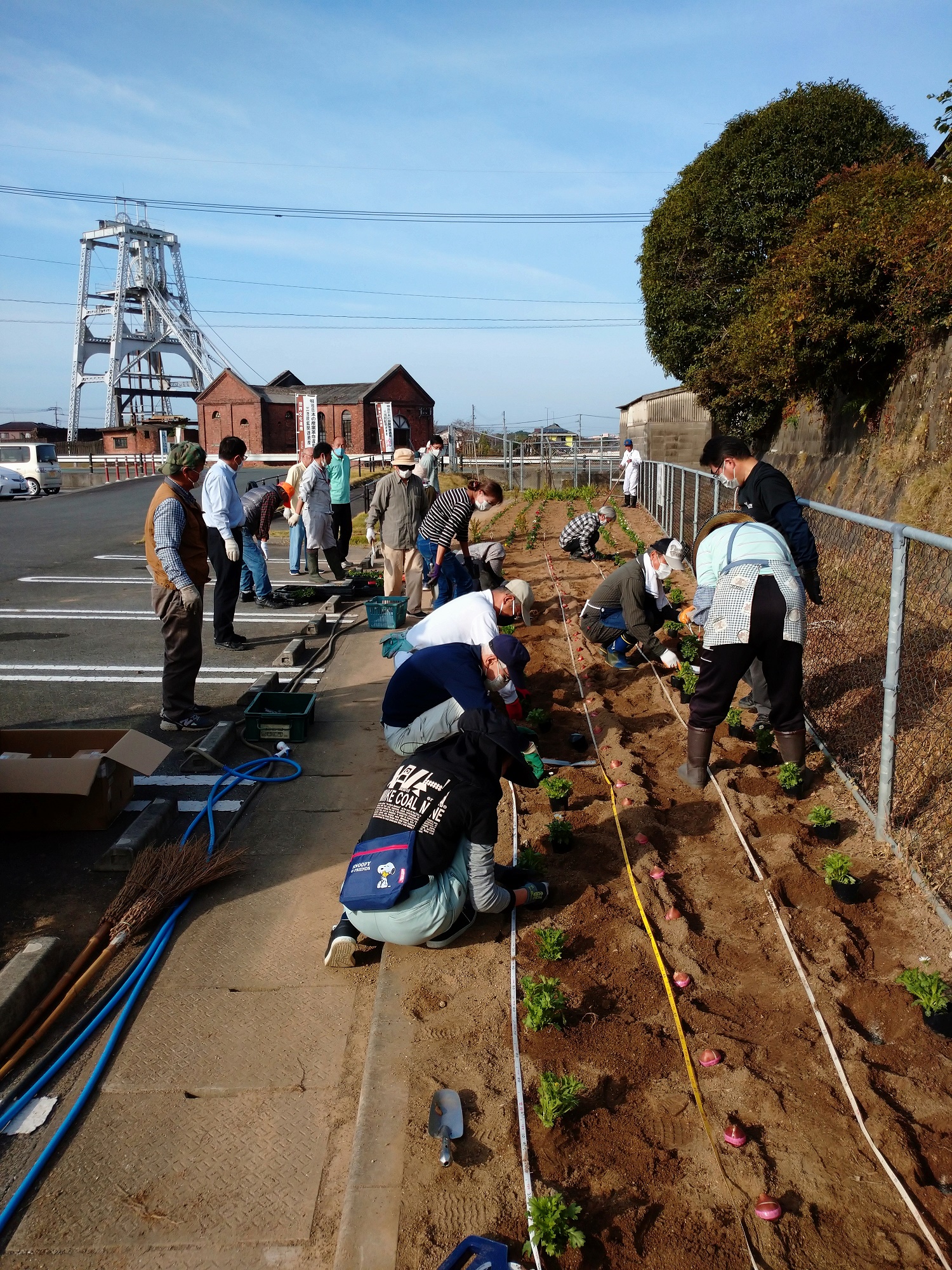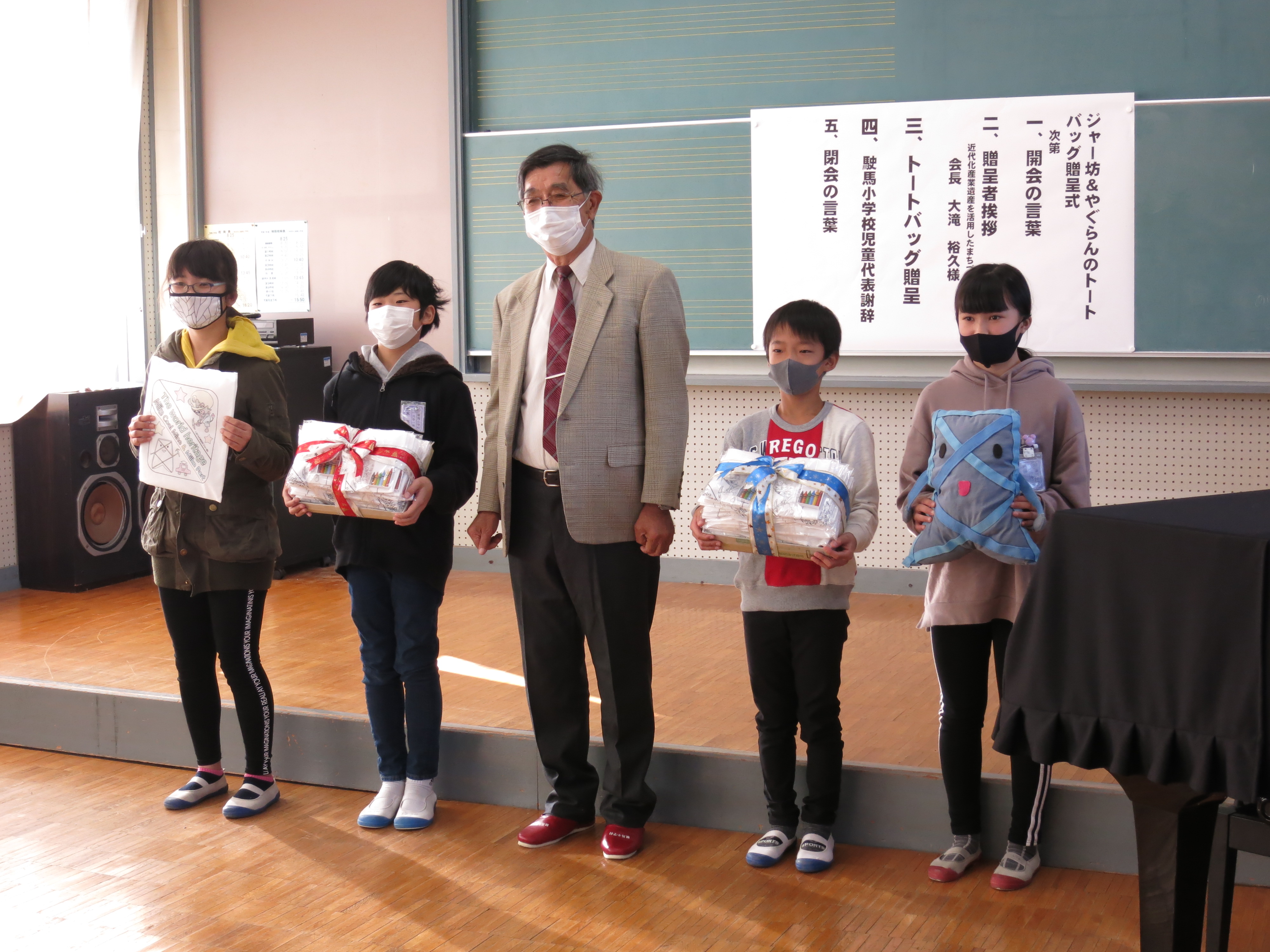 12月2日、宮原坑でボランティアガイド活動をしている駛馬小学校6年生の皆さんに、日ごろの活動への感謝の気持ちを込めて、大牟田市近代化産業遺産を活用したまちづくり協議会の大滝裕久会長から「ジャー坊&やぐらんのトートバッグ」をプレゼントしました。このトートバッグは同協議会が世界遺産登録5周年を記念して作成したもので、バッグに描かれている「やぐらん」は2015年に当時の駛馬小学校6年生が制作した宮原坑の竪坑やぐらをモチーフにしたキャラクターです。