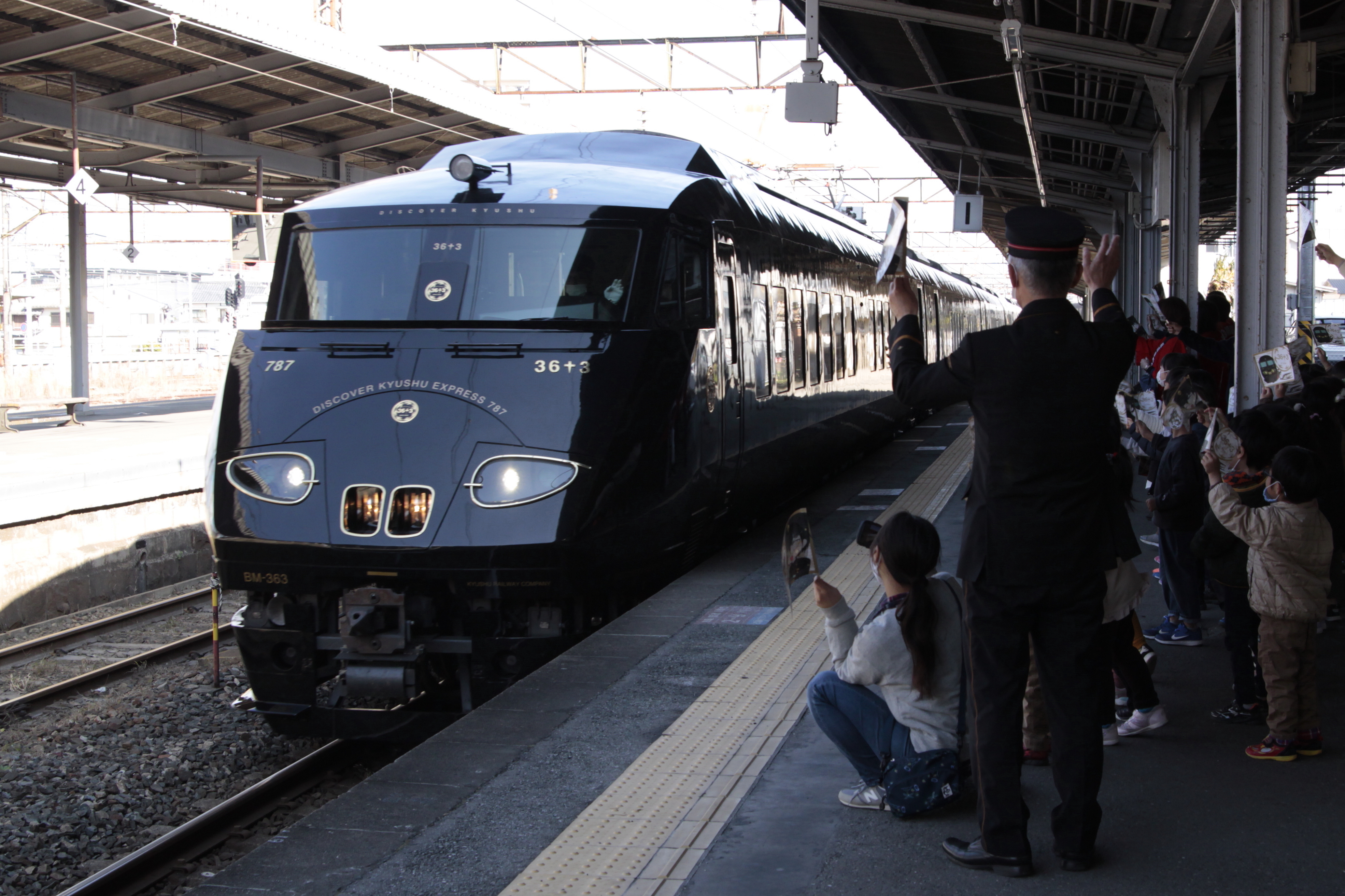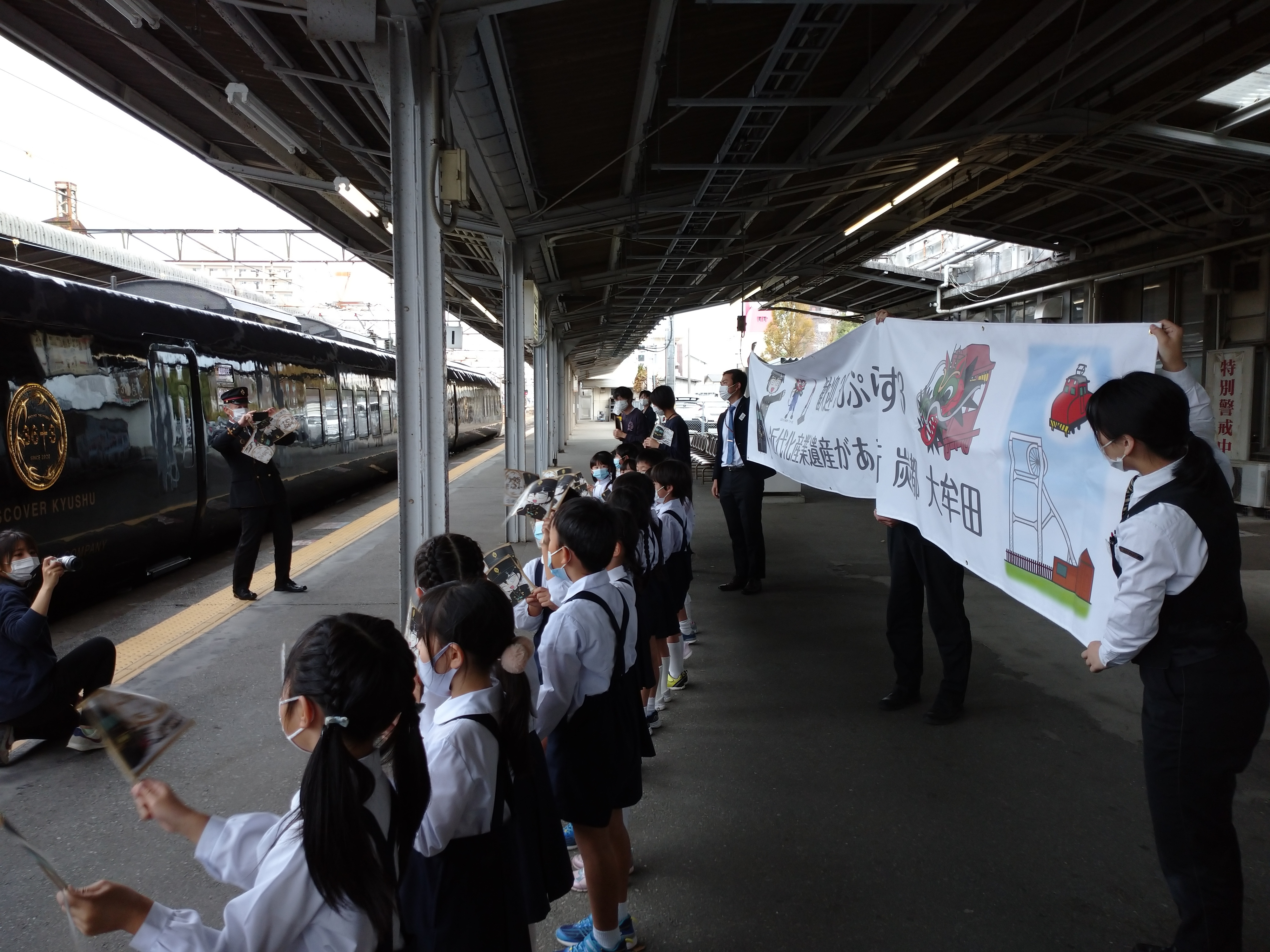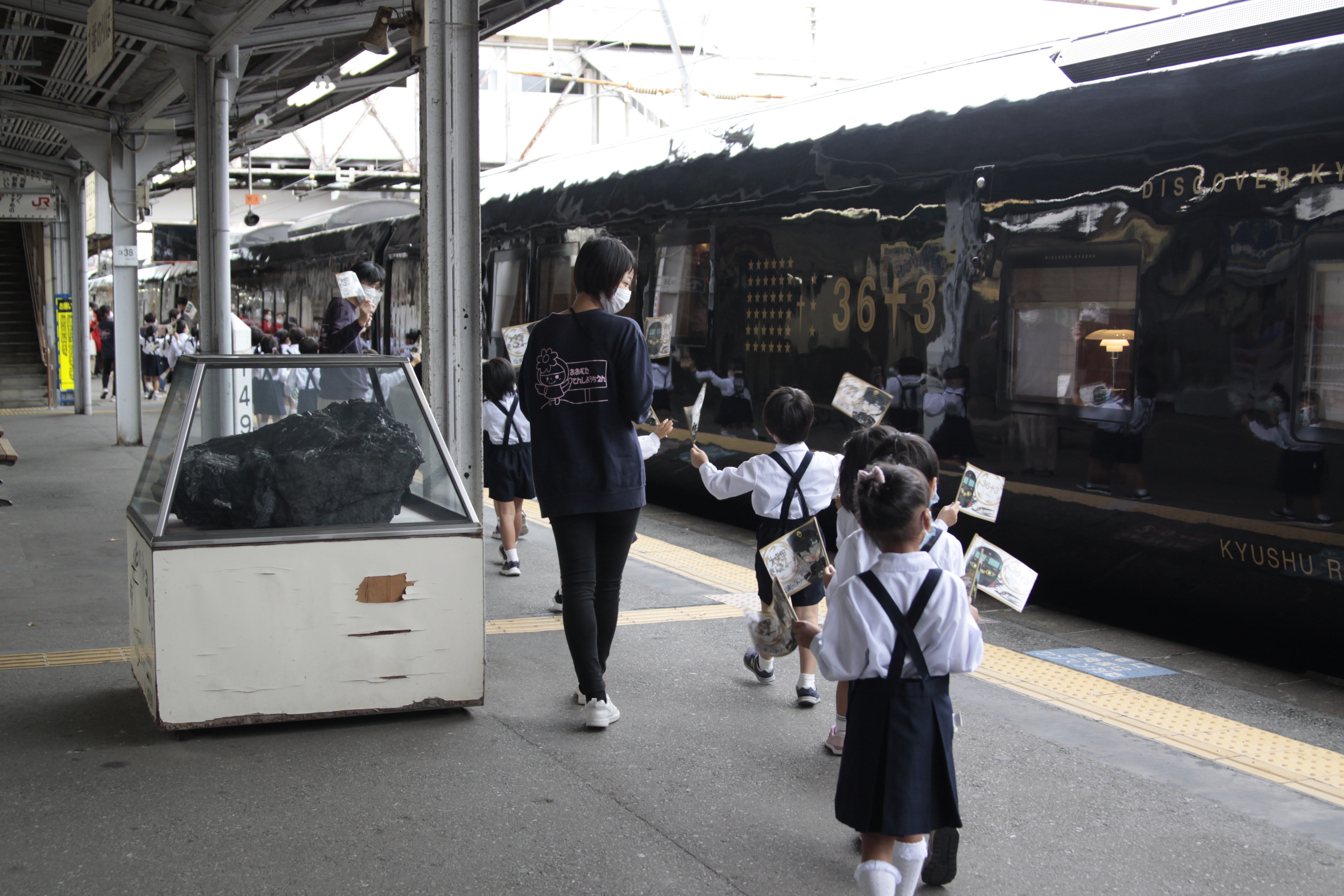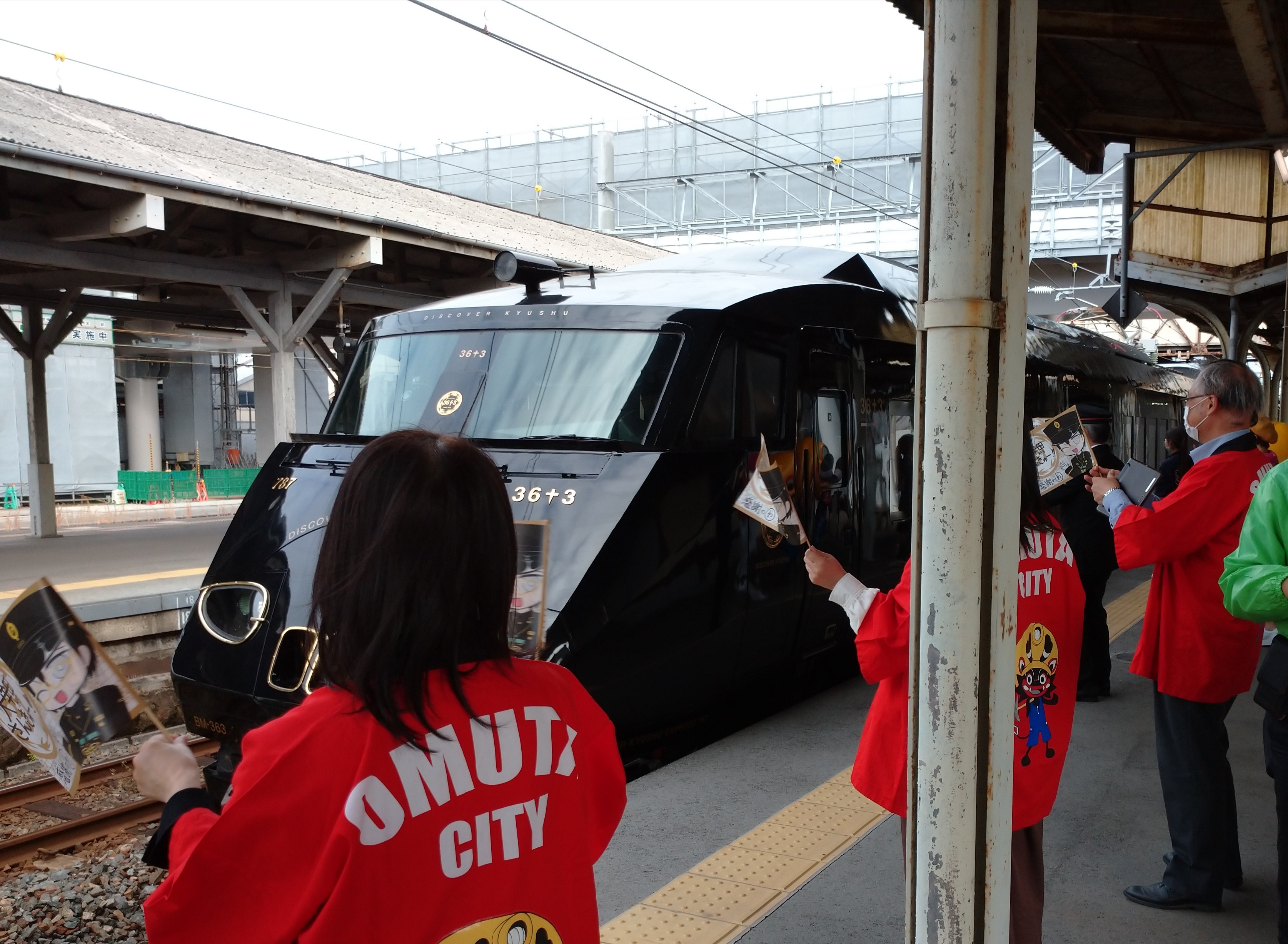 この秋運行が始まったJR九州の新しい観光列車「36+3」。毎週木曜日には博多→鹿児島中央間で運行され、大牟田駅には乗務員交代のため10:53(休日は10:56)から2分間停車します。残念ながら扉は開かず乗降もできませんが、この機会をとらえて幼稚園児の皆さんや大牟田駅の皆さんと小旗を振ってお出迎えをしています。